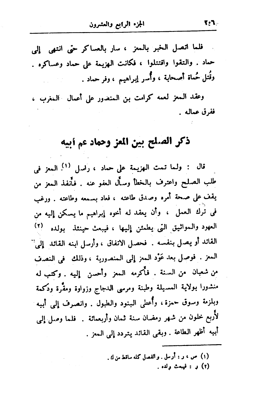 قال: ولما تمت الهزيمة على حماد، راسل «1» المعز فى طلب الصلح واعترف بالخطأ وسأل العفو عنه. فأنفذ المعز من يقف على صحة أمره وصدق طاعته، فعاد بسمعه وطاعته. ورغب فى ترك العمل، وأن يعقد له أخوه إبراهيم ما يسكن إليه من العهود والمواثيق التى يطمئن إليها، فيبعث حينئذ بولده «2» القائد أو يصل بنفسه. فحصل الاتفاق، وأرسل ابنه القائد إلى المعز. فوصل بعد عود المعز إلى المنصورية، وذلك فى النصف من شعبان من السنة. فأكرمه المعز وأحسن إليه. وكتب له منشورا بولاية المسيلة وطبنة ومرسى الدجاج وزواوة ومقرّة ودكمة وبلزمة وسوق حمزة، وأعطى البنود والطبول. وانصرف إلى أبيه لأربع خلون من شهر رمضان سنة ثمان وأربعمائة. فلما وصل إلى أبيه أظهر الطاعة. وبقى القائد يتردد إلى المعز.