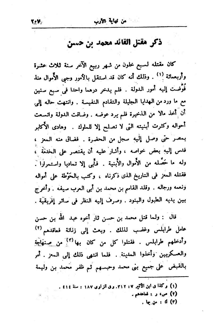 قال: ولما قتل محمد بن حسن ثار أخوه عبد الله بن حسن عامل طرابلس وغضب لذلك. وبعث إلى زناتة فعاقدهم «2» وأدخلهم طرابلس. فقتلوا كل من كان بها «3» من صنهاجة والعسكريين وأخذوا المدينة. فلما انتهى ذلك إلى المعز. وأمر بالقبض على جميع بنى محمد وحبسهم ثم ظفر محمد بن وليمة