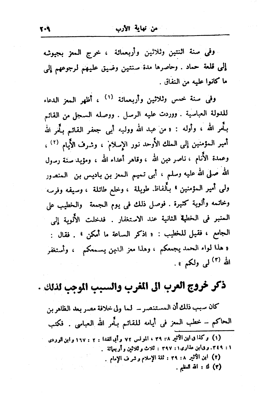 وفى سنة خمس وثلاثين وأربعمائة «1» ، أظهر المعز الدعاء للدولة العباسية. ووردت عليه الرسل. ووصله السجل من القائم بأمر الله، وأوله: «من عبد الله ووليه أبى جعفر القائم بأمر الله أمير المؤمنين إلى الملك الأوحد نور الإسلام، وشرف الأيام «2» ، وعمدة الأنام، ناصر دين الله، وقاهر أعداء الله، ومؤيد سنة رسول الله صلى الله عليه وسلم، أبى تميم المعز بن باديس بن المنصور ولى أمير المؤمنين» بألفاظ طويلة، وخلع طائلة، وسيفه وفرسه وخاتمه وألوية كثيرة. فوصل ذلك فى يوم الجمعة والخطيب على المنبر فى الخطبة الثانية عند الاستغفار. فدخلت الألوية إلى الجامع، فقيل للخطيب: «اذكر الساعة ما أمكن» . فقال: