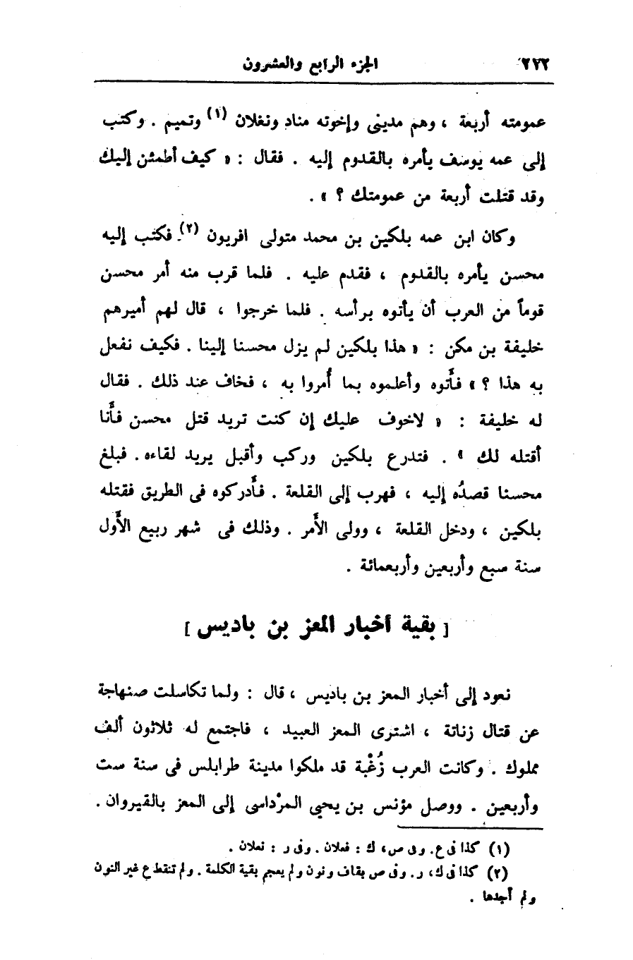 وكان ابن عمه بلكين بن محمد متولى افريون «2» فكتب إليه محسن يأمره بالقدوم، فقدم عليه. فلما قرب منه أمر محسن قوما من العرب أن يأتوه برأسه. فلما خرجوا، قال لهم أميرهم خليفة بن مكن: «هذا بلكين لم يزل محسنا إلينا. فكيف نفعل به هذا؟» فأتوه وأعلموه بما أمروا به، فخاف عند ذلك. فقال له خليفة: «لا خوف عليك إن كنت تريد قتل محسن فأنا أقتله لك» . فتدرع بلكين وركب وأقبل يريد لقاءه. فبلغ محسنا قصده إليه، فهرب إلى القلعة. فأدركوه فى الطريق فقتله بلكين، ودخل القلعة، وولى الأمر. وذلك فى شهر ربيع الأول سنة سبع وأربعين وأربعمائة.