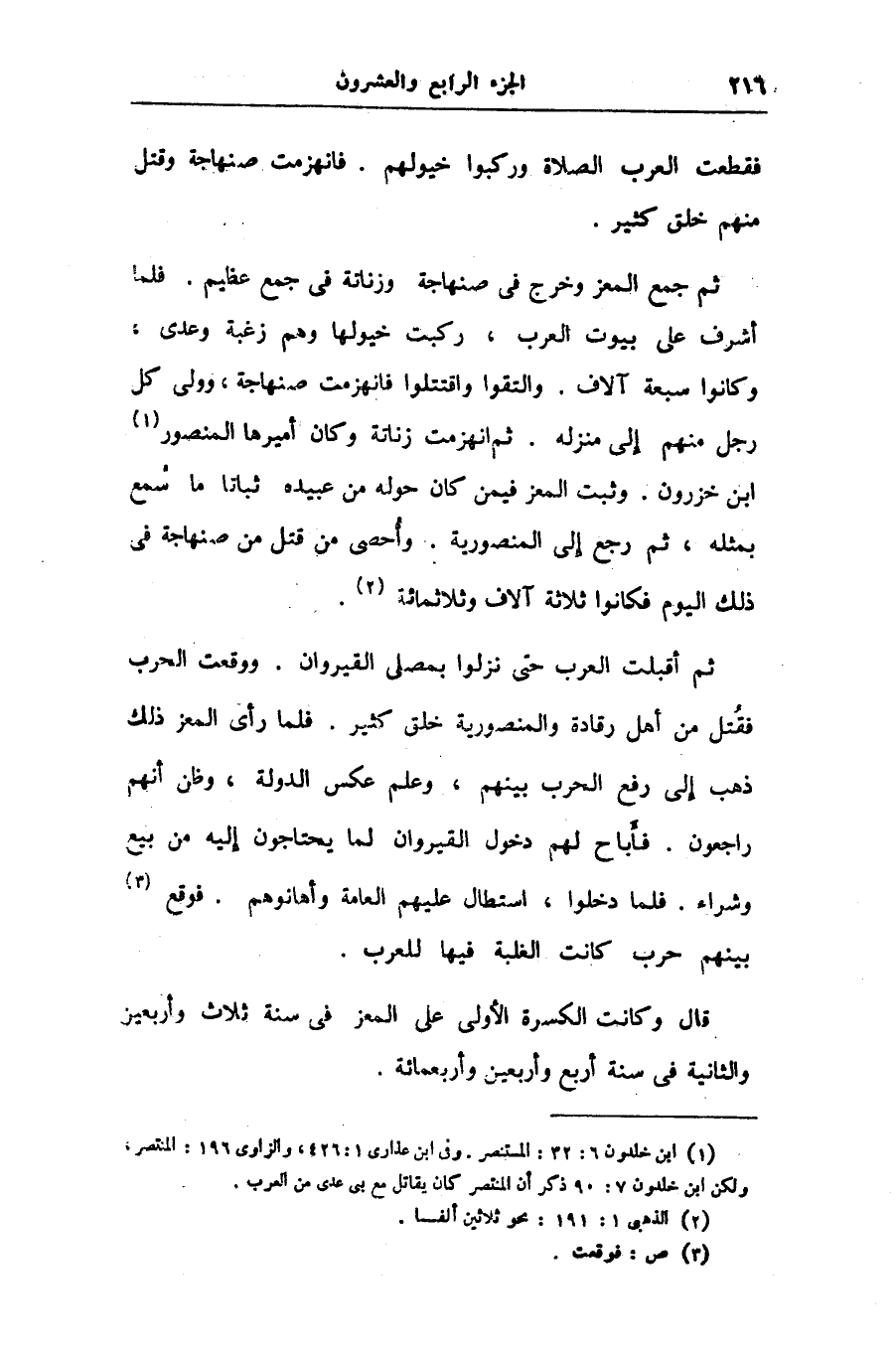 ثم جمع المعز وخرج فى صنهاجة وزنانة فى جمع عظيم. فلما أشرف على بيوت العرب، ركبت خيولها وهم زغبة وعدى، وكانوا سبعة آلاف. والتقوا واقتتلوا فانهزمت صنهاجة، وولى كل رجل منهم إلى منزله. ثم انهزمت زناتة وكان أميرها المنصور «1» ابن خزرون. وثبت المعز فيمن كان حوله من عبيده ثباتا ما سمع بمثله، ثم رجع إلى المنصورية. وأحصى من قتل من صنهاجة فى ذلك اليوم فكانوا ثلاثة آلاف وثلاثمائة «2» .