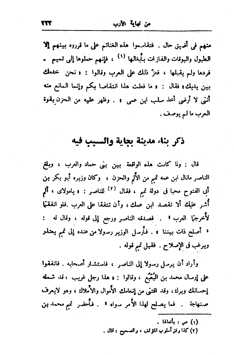 قال: ولما كانت هذه الواقعة بين بنى حماد والعرب، وبلغ الناصر ما نال ابن عمه تميم من الألم والحزن، وكان وزيره أبو بكر بن أبى الفتوح محبا فى دولة تميم، فقال «2» للناصر: «يا مولاى، ألم أشر عليك ألا تقصد ابن عمك، وأن تتفقا على العرب. فلو اتفقتما لأخرجتما العرب» . فصدقه الناصر ورجع إلى قوله، وقال له: