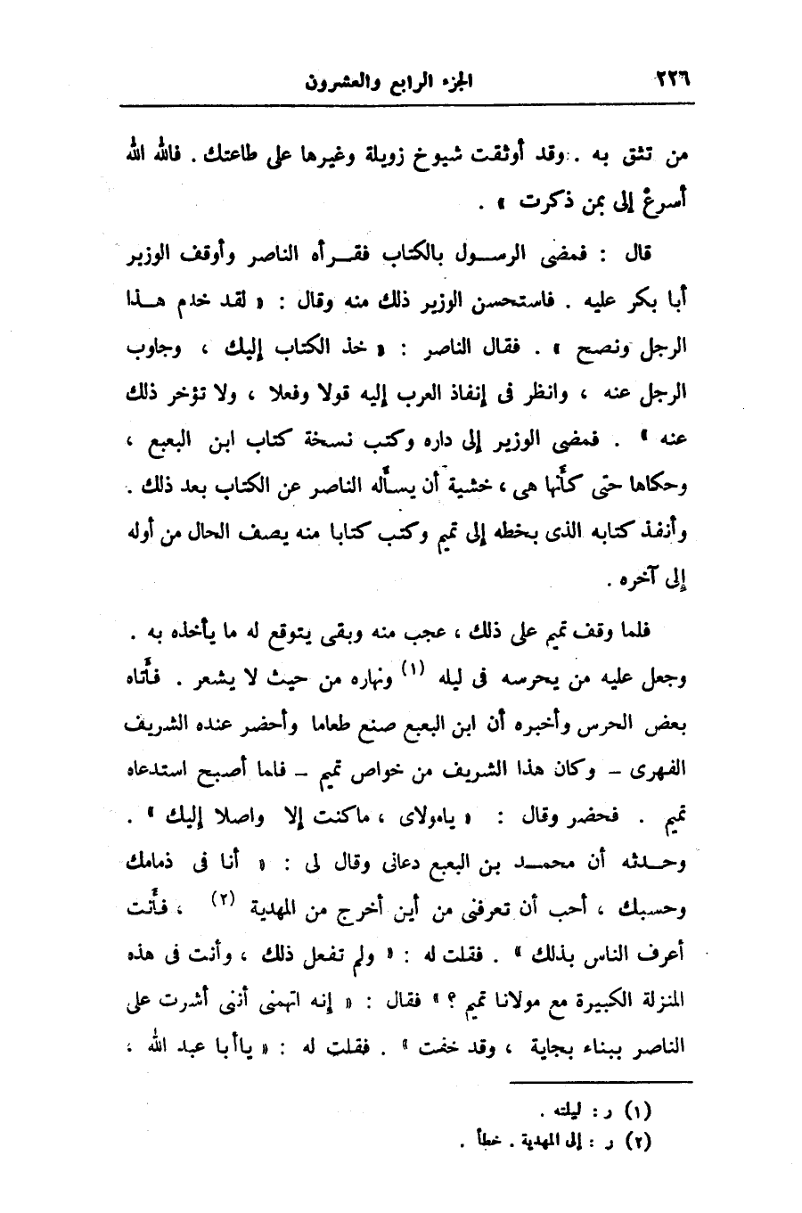 قال: فمضى الرسول بالكتاب فقرأه الناصر وأوقف الوزير أبا بكر عليه. فاستحسن الوزير ذلك منه وقال: «لقد خدم هذا الرجل ونصح» . فقال الناصر: «خذ الكتاب إليك، وجاوب الرجل عنه، وانظر فى إنفاذ العرب إليه قولا وفعلا، ولا تؤخر ذلك عنه» . فمضى الوزير إلى داره وكتب نسخة كتاب ابن البعبع، وحكاها حتى كأنها هى، خشية أن يسأله الناصر عن الكتاب بعد ذلك.