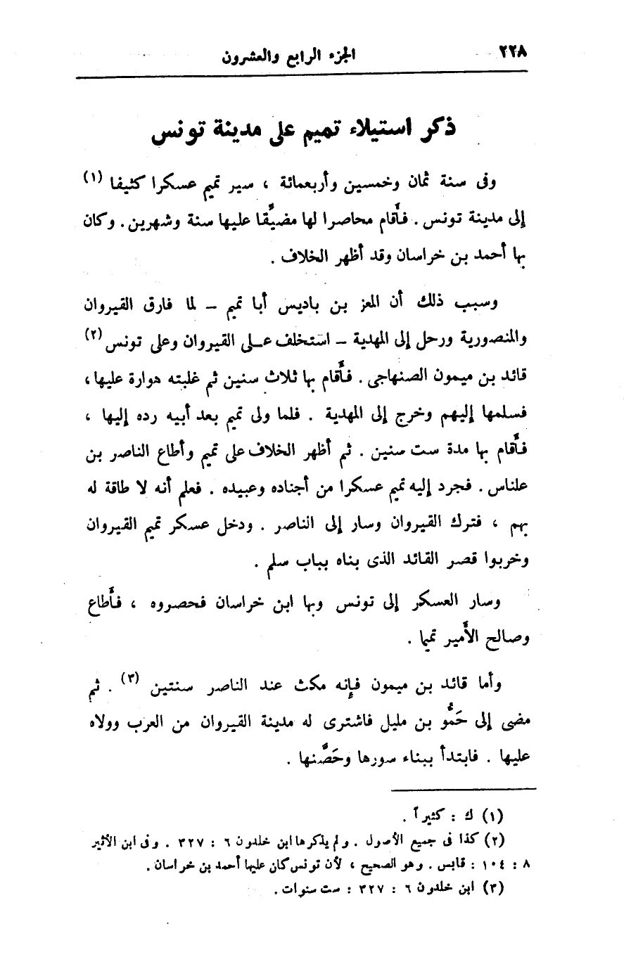 وفى سنة ثمان وخمسين وأربعمائة، سير تميم عسكرا كثيفا «1» إلى مدينة تونس. فأقام محاصرا لها مضيّقا عليها سنة وشهرين. وكان بها أحمد بن خراسان وقد أظهر الخلاف.