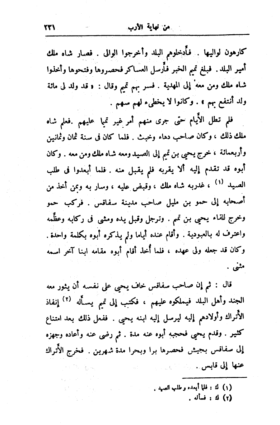 قال: ثم إن صاحب سفاقس خاف يحيى على نفسه أن يثور معه الجند وأهل البلد فيملكوه عليهم، فكتب إلى تميم يسأله «2» إنفاذ الأتراك وأولادهم إليه ليرسل إليه ابنه يحيى. ففعل ذلك بعد امتناع كثير. وقدم يحيى فحجبه أبوه عنه مدة. ثم رضى عنه وأعاده وجهزه إلى سفاقس بجيش فحصرها برا وبحرا مدة شهرين. فخرج الأتراك عنها إلى قابس.