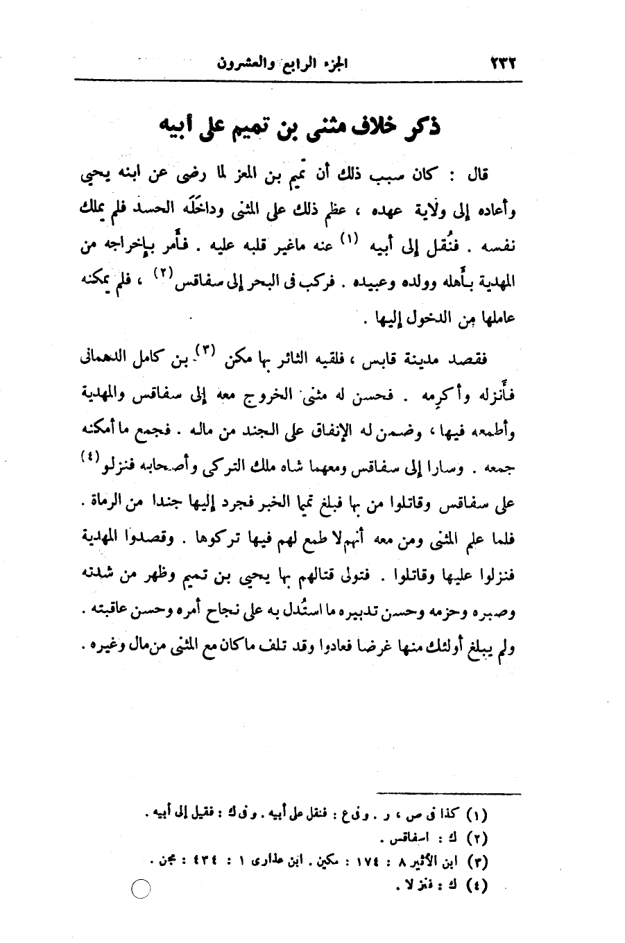قال: كان سبب ذلك أن تميم بن المعز لما رضى عن ابنه يحيى وأعاده إلى ولاية عهده، عظم ذلك على المثنى وداخله الحسد فلم يملك نفسه. فنقل إلى أبيه «1» عنه ما غير قلبه عليه. فأمر بإخراجه من المهدية بأهله وولده وعبيده. فركب فى البحر إلى سفاقس «2» ، فلم يمكنه عاملها من الدخول إليها.
