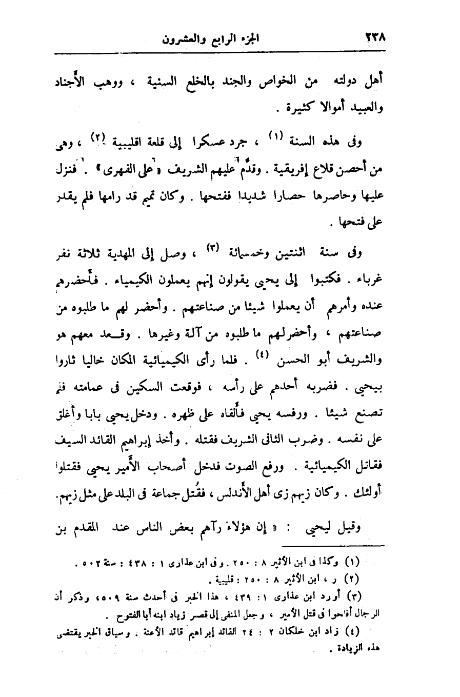 وفى سنة اثنتين وخمسمائة «3» ، وصل إلى المهدية ثلاثة نفر غرباء. فكتبوا إلى يحيى يقولون إنهم يعملون الكيمياء. فأحضرهم عنده وأمرهم أن يعملوا شيئا من صناعتهم. وأحضر لهم ما طلبوه من صناعتهم، وأحضر لهم ما طلبوه من آلة وغيرها. وقعد معهم هو والشريف أبو الحسن «4» . فلما رأى الكيميائية المكان خاليا ثاروا بيحيى. فضربه أحدهم على رأسه، فوقعت السكين فى عمامته فلم تصنع شيئا. ورفسه يحيى فألقاه على ظهره. ودخل يحيى بابا وأغلق على نفسه. وضرب الثانى الشريف فقتله. وأخذ إبراهيم القائد السيف فقاتل الكيميائية. ورفع الصوت فدخل أصحاب الأمير يحيى فقتلوا أولئك. وكان زيهم زى أهل الأندلس، فقتل جماعة فى البلد على مثل زيهم.