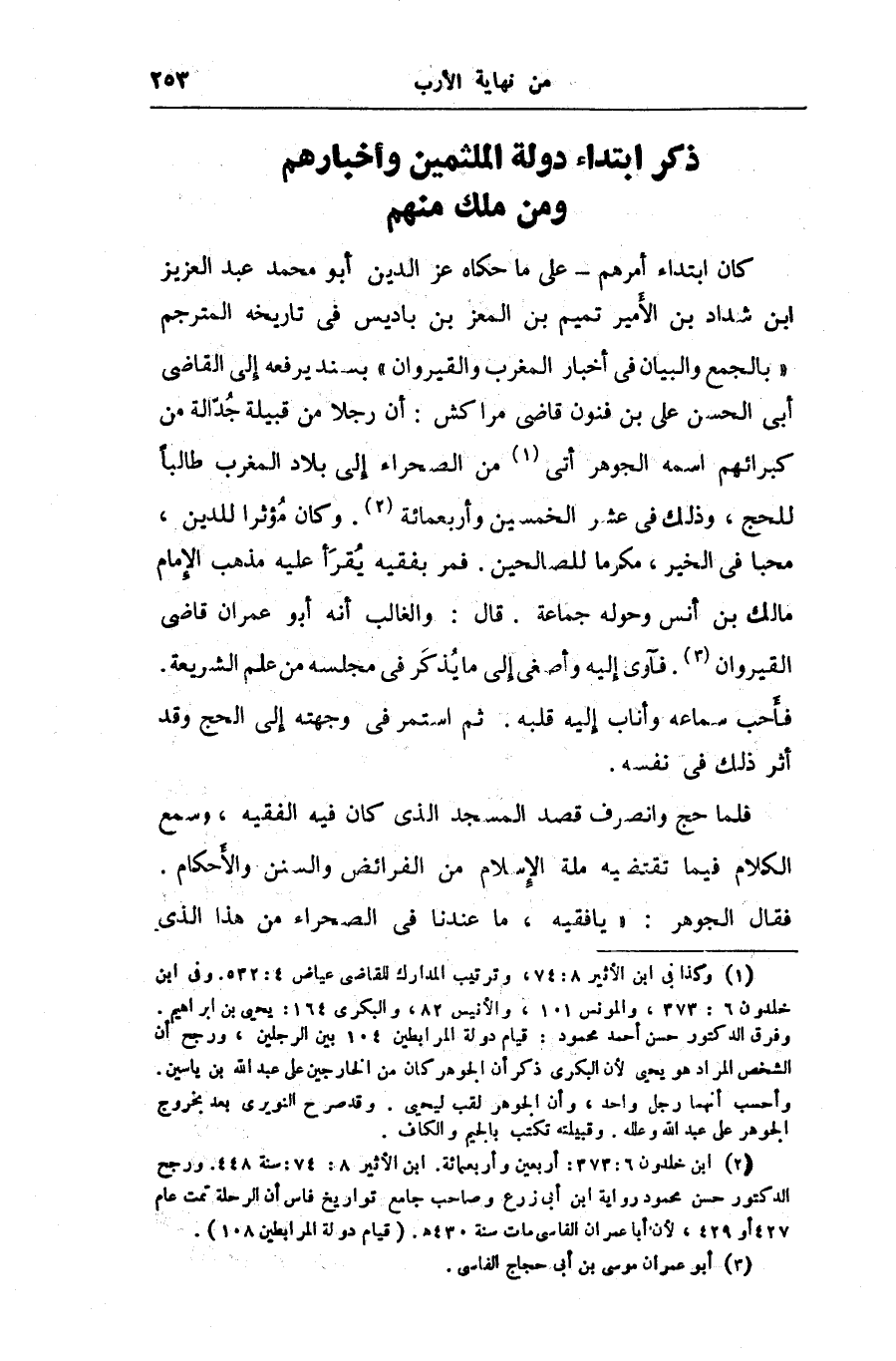 كان ابتداء أمرهم- على ما حكاه عز الدين أبو محمد عبد العزيز ابن شداد بن الأمير تميم بن المعز بن باديس فى تاريخه المترجم «بالجمع والبيان فى أخبار المغرب والقيروان» بسند يرفعه إلى القاضى أبى الحسن على بن فنون قاضى مراكش: أن رجلا من قبيلة جدّالة من كبرائهم اسمه الجوهر أتى «1» من الصحراء إلى بلاد المغرب طالبا للحج، وذلك فى عشر الخمسين وأربعمائة «2» . وكان مؤثرا للدين، محبا فى الخير، مكرما للصالحين. فمر بفقيه يقرأ عليه مذهب الإمام مالك بن أنس وحوله جماعة. قال: والغالب أنه أبو عمران قاضى القيروان «3» . فآوى إليه وأصغى إلى ما يذكر فى مجلسه من علم الشريعة.