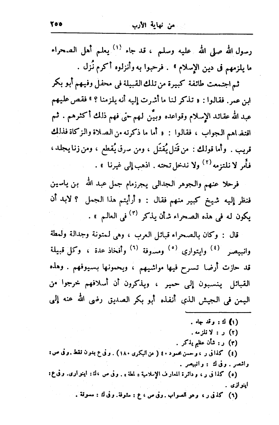 ثم اجتمعت طائفة كبيرة من تلك القبيلة فى محفل وفيهم أبو بكر ابن عمر. فقالوا: «تذكر لنا ما أشرت إليه أنه يلزمنا؟» فقص عليهم عبد الله عقائد الإسلام وقواعده وبيّن لهم حتى فهم ذلك أكثرهم. ثم اقتضاهم الجواب، فقالوا: «أما ما ذكرته من الصلاة والزكاة فذلك قريب. وأما قولك: من قتل يقتل، ومن سرق يقطع، ومن زنا يجلد، فأمر لا نلتزمه «2» ولا ندخل تحته. اذهب إلى غيرنا» .