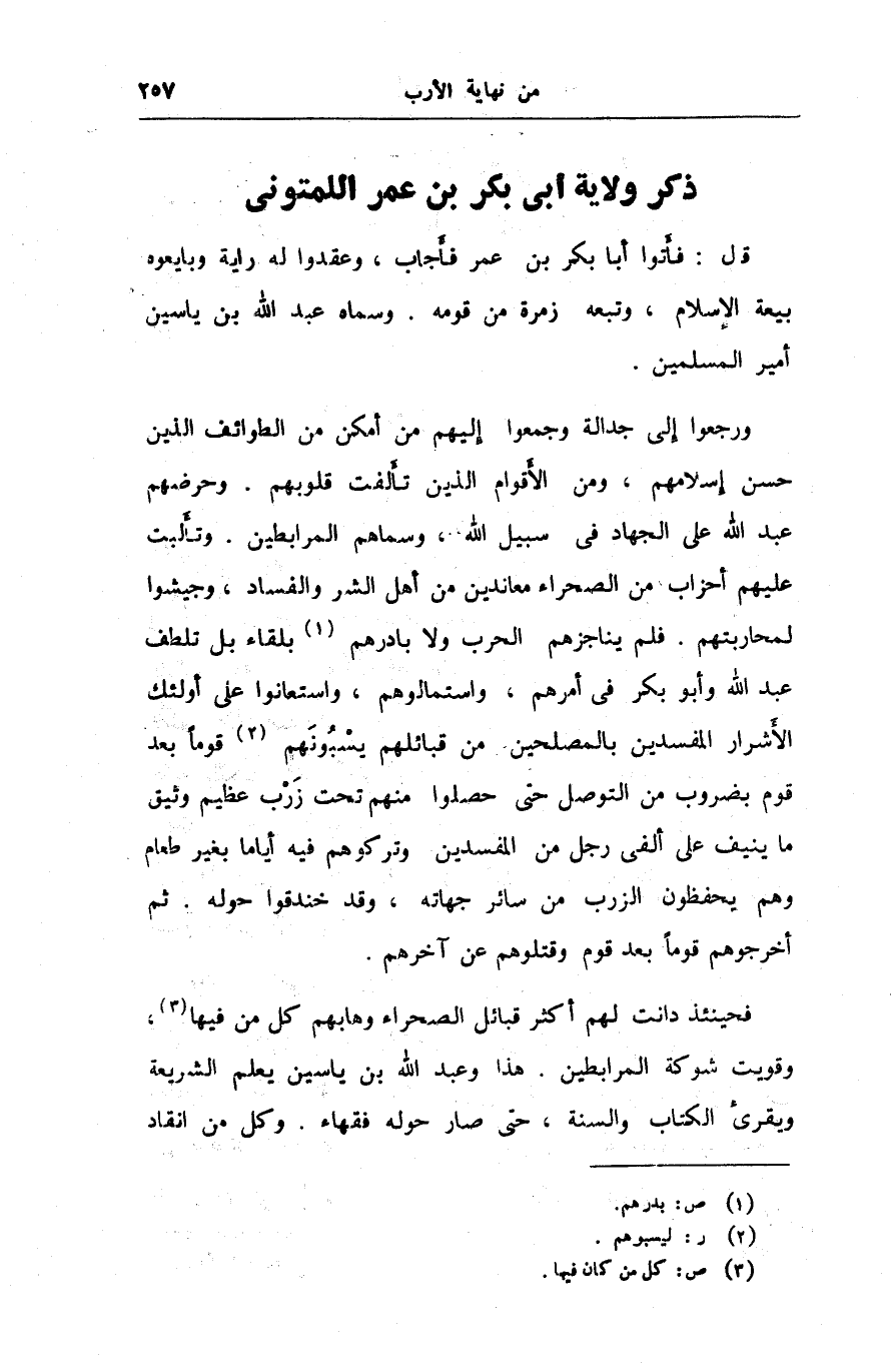 ورجعوا إلى جدالة وجمعوا إليهم من أمكن من الطوائف الذين حسن إسلامهم، ومن الأقوام الذين تألفت قلوبهم. وحرضهم عبد الله على الجهاد فى سبيل الله، وسماهم المرابطين. وتألبت عليهم أحزاب من الصحراء معاندين من أهل الشر والفساد، وجيشوا لمحاربتهم. فلم يناجزهم الحرب ولا بادرهم «1» بلقاء بل تلطف عبد الله وأبو بكر فى أمرهم، واستمالوهم، واستعانوا على أولئك الأشرار المفسدين بالمصلحين من قبائلهم يسبونهم «2» قوما بعد قوم بضروب من التوصل حتى حصلوا منهم تحت زرب عظيم وثيق ما ينيف على ألفى رجل من المفسدين وتركوهم فيه أياما بغير طعام وهم يحفظون الزرب من سائر جهاته، وقد خندقوا حوله. ثم أخرجوهم قوما بعد قوم وقتلوهم عن آخرهم.