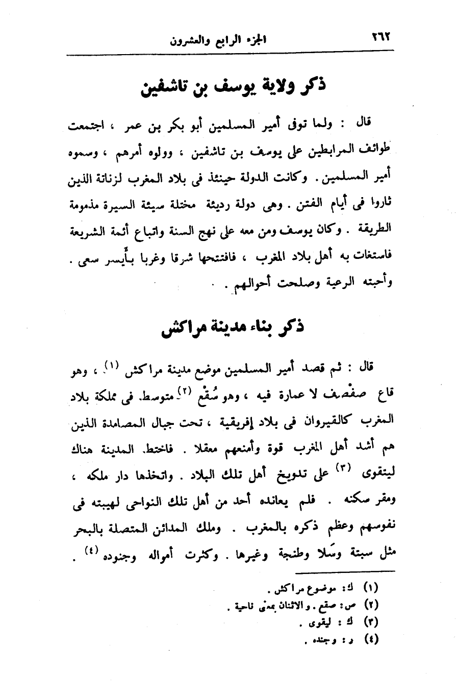 قال: ولما توفى أمير المسلمين أبو بكر بن عمر، اجتمعت طوائف المرابطين على يوسف بن تاشفين، وولوه أمرهم، وسموه أمير المسلمين. وكانت الدولة حينئذ فى بلاد المغرب لزناتة الذين ثاروا فى أيام الفتن. وهى دولة رديئة مختلة سيئة السيرة مذمومة الطريقة. وكان يوسف ومن معه على نهج السنة واتباع أئمة الشريعة فاستغات به أهل بلاد المغرب، فافتتحها شرقا وغربا بأيسر سعى.