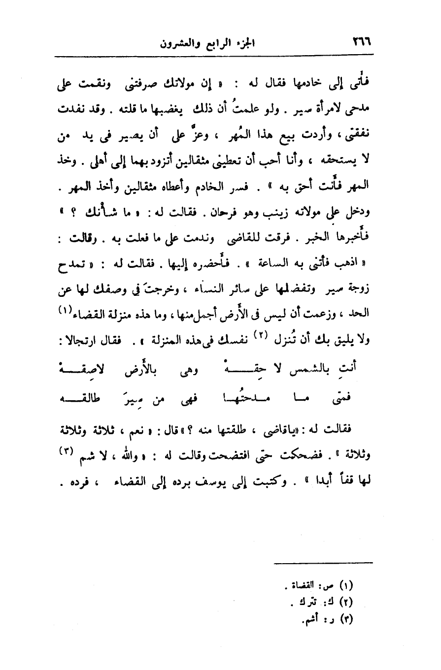 «اذهب فأتنى به الساعة» . فأحضره إليها. فقالت له: «تمدح زوجة سير وتفضلها على سائر النساء، وخرجت فى وصفك لها عن الحد، وزعمت أن ليس فى الأرض أجمل منها، وما هذه منزلة القضاء «1» ولا يليق بك أن تنزل «2» نفسك فى هذه المنزلة» . فقال ارتجالا: