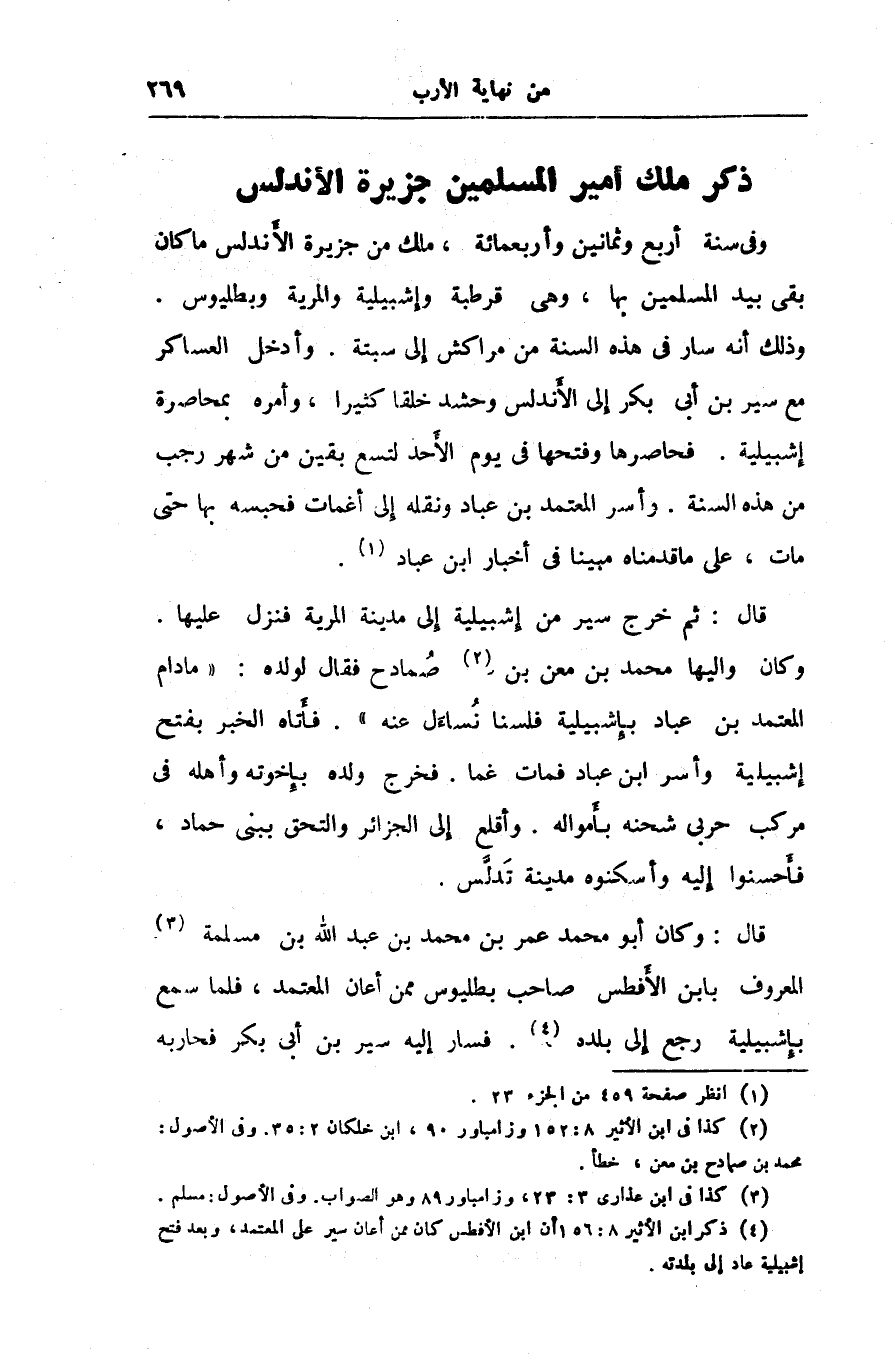 قال: وكان أبو محمد عمر بن محمد بن عبد الله بن مسلمة «3» المعروف بابن الأفطس صاحب بطليوس ممن أعان المعتمد، فلما سمع بإشبيلية رجع إلى بلده «4» . فسار إليه سير بن أبى بكر فحاربه