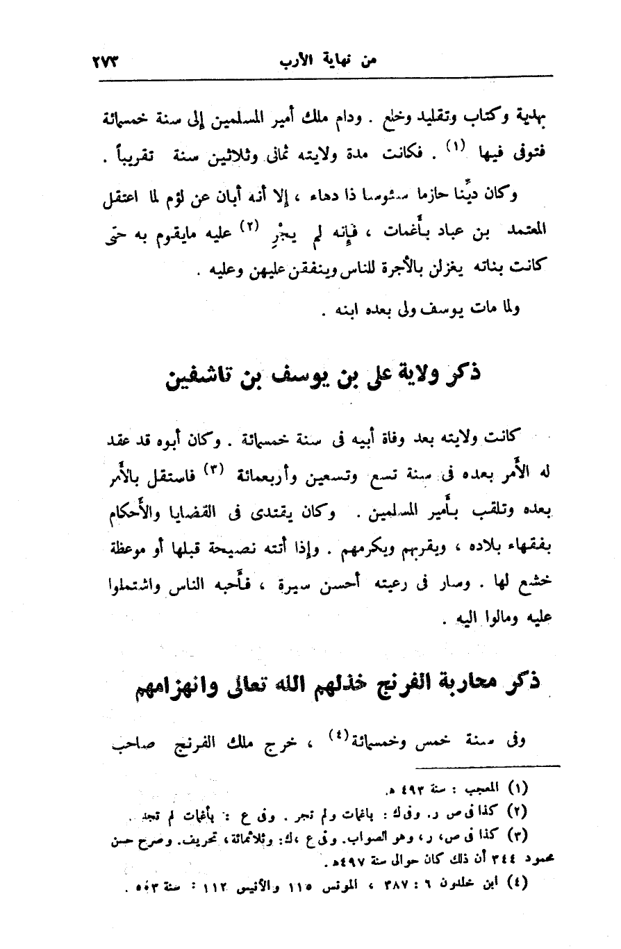 بهدية وكتاب وتقليد وخلع. ودام ملك أمير المسلمين إلى سنة خمسمائة فتوفى فيها «1» . فكانت مدة ولايته ثمانى وثلاثين سنة تقريبا.