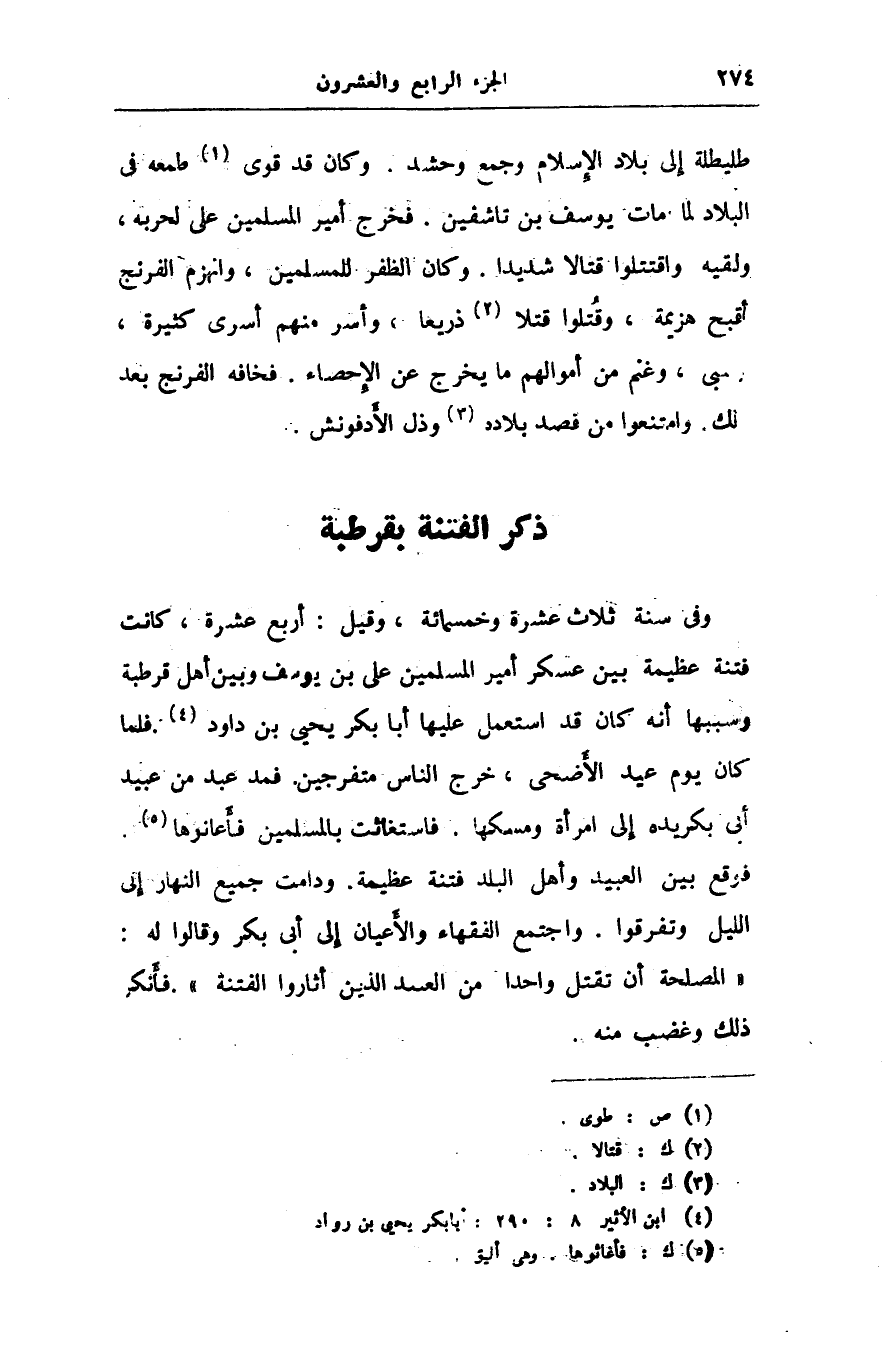 وفى سنة ثلاث عشرة وخمسمائة، وقيل: أربع عشرة، كانت فتنة عظيمة بين عسكر أمير المسلمين على بن يوسف وبين أهل قرطبة وسببها أنه كان قد استعمل عليها أبا بكر يحيى بن داود «4» . فلما كان يوم عيد الأضحى، خرج الناس متفرجين. فمد عبد من عبيد أبى بكريده إلى امرأة ومسكها. فاستغاثت بالمسلمين فأعانوها «5» .