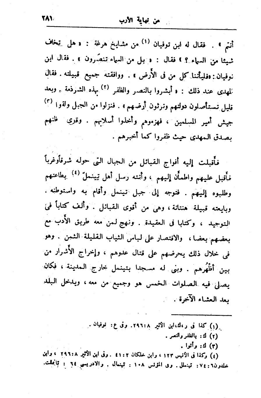 أنتم» . فقال له ابن توفيان «1» من مشايخ هرغة: «هل تخاف شيئا من السماء؟» فقال: «بل من السماء تنصرون» . فقال ابن توفيان: «فليأتنا كل من فى الأرض» . ووافقته جميع قبيلته. فقال المهدى عند ذلك: «أبشروا بالنصر والظفر «2» بهذه الشرذمة. وبعد قليل تستأصلون دولتهم وترثون أرضهم» . فنزلوا من الجبل ولقوا «3» جيش أمير المسلمين، فهزموهم وأخذوا أسلابهم. وقوى ظنهم بصدق المهدى حيث ظفروا كما أخبرهم.