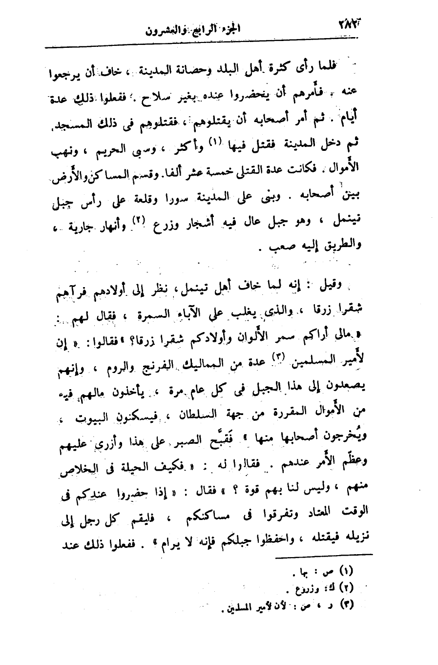 فلما رأى كثرة أهل البلد وحصانة المدينة، خاف أن يرجعوا عنه. فأمرهم أن يحضروا عنده بغير سلاح. ففعلوا ذلك عدة أيام. ثم أمر أصحابه أن يقتلوهم، فقتلوهم فى ذلك المسجد.