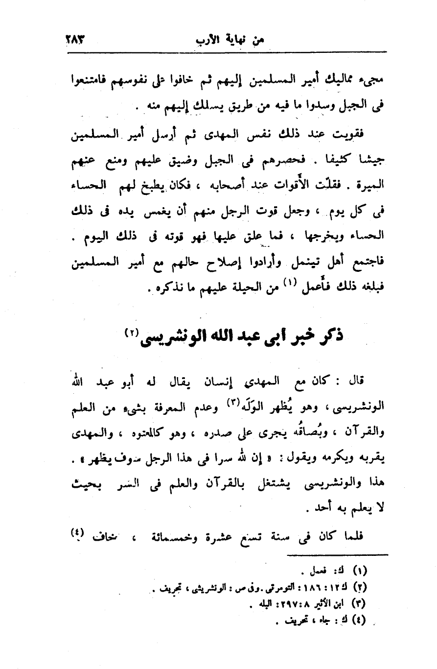 قال: كان مع المهدى إنسان يقال له أبو عبد الله الونشريسى، وهو يظهر الوله «3» وعدم المعرفة بشىء من العلم والقرآن، وبصاقه يجرى على صدره، وهو كالمعتوه، والمهدى يقربه ويكرمه ويقول: «إن لله سرا فى هذا الرجل سوف يظهر» .