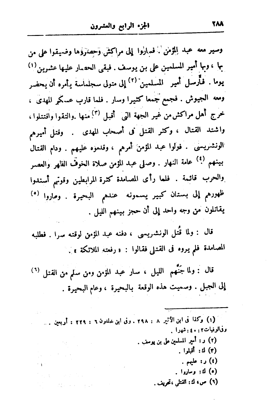 قال: ولما جنّهم الليل، سار عبد المؤمن ومن سلم من القتل «6» إلى الجبل. وسميت هذه الوقعة بالبحيرة، وعام البحيرة.