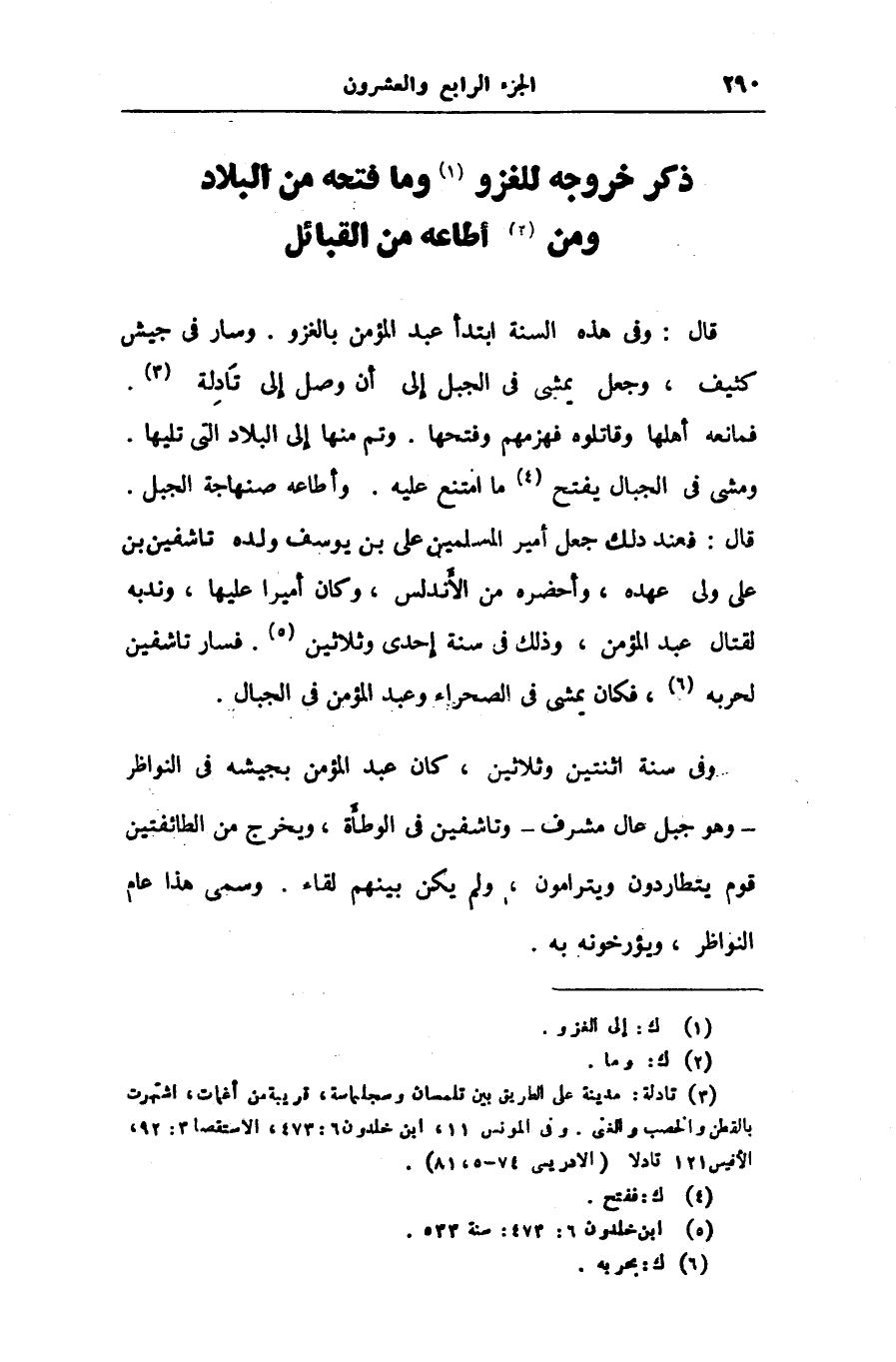 قال: وفى هذه السنة ابتدأ عبد المؤمن بالغزو. وسار فى جيش كثيف، وجعل يمشى فى الجبل إلى أن وصل إلى تادلة «3» .