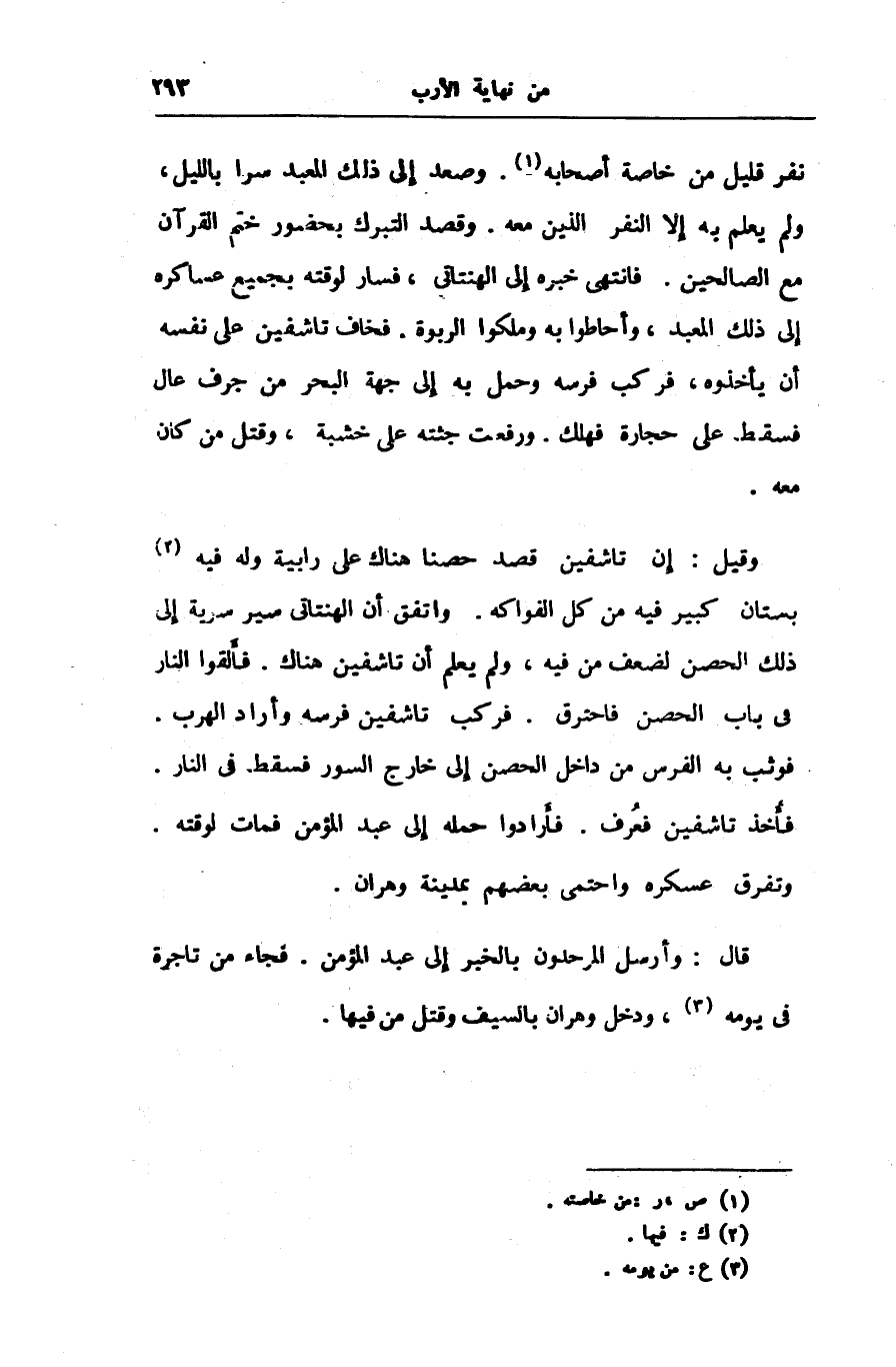 وقيل: إن تاشفين قصد حصنا هناك على رابية وله فيه «2» بستان كبير فيه من كل الفواكه. واتفق أن الهنتاتى سير سرية إلى ذلك الحصن لضعف من فيه، ولم يعلم أن تاشفين هناك. فألقوا النار فى باب الحصن فاحترق. فركب تاشفين فرسه وأراد الهرب.