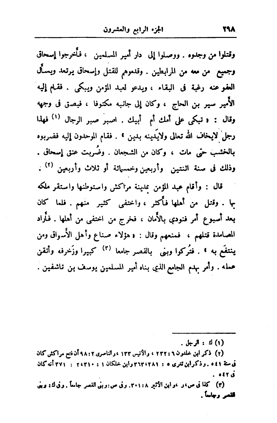 وقتلوا من وجدوه. ووصلوا إلى دار أمير المسلمين، فأخرجوا إسحاق وجميع من معه من المرابطين. وقدموهم للقتل وإسحاق يرتعد ويسأل العفو عنه رغبة فى البقاء، ويدعو لعبد المؤمن ويبكى. فقام إليه الأمير سير بن الحاج، وكان إلى جانبه مكتوفا، فبصق فى وجهه وقال: «تبكى على أمك أم أبيك. اصبر صبر الرجال «1» فهذا رجل لا يخاف الله تعالى ولا يدينه بدين» . فقام الموحدون إليه فضربوه بالخشب حتى مات، وكان من الشجعان. وضربت عنق إسحاق.