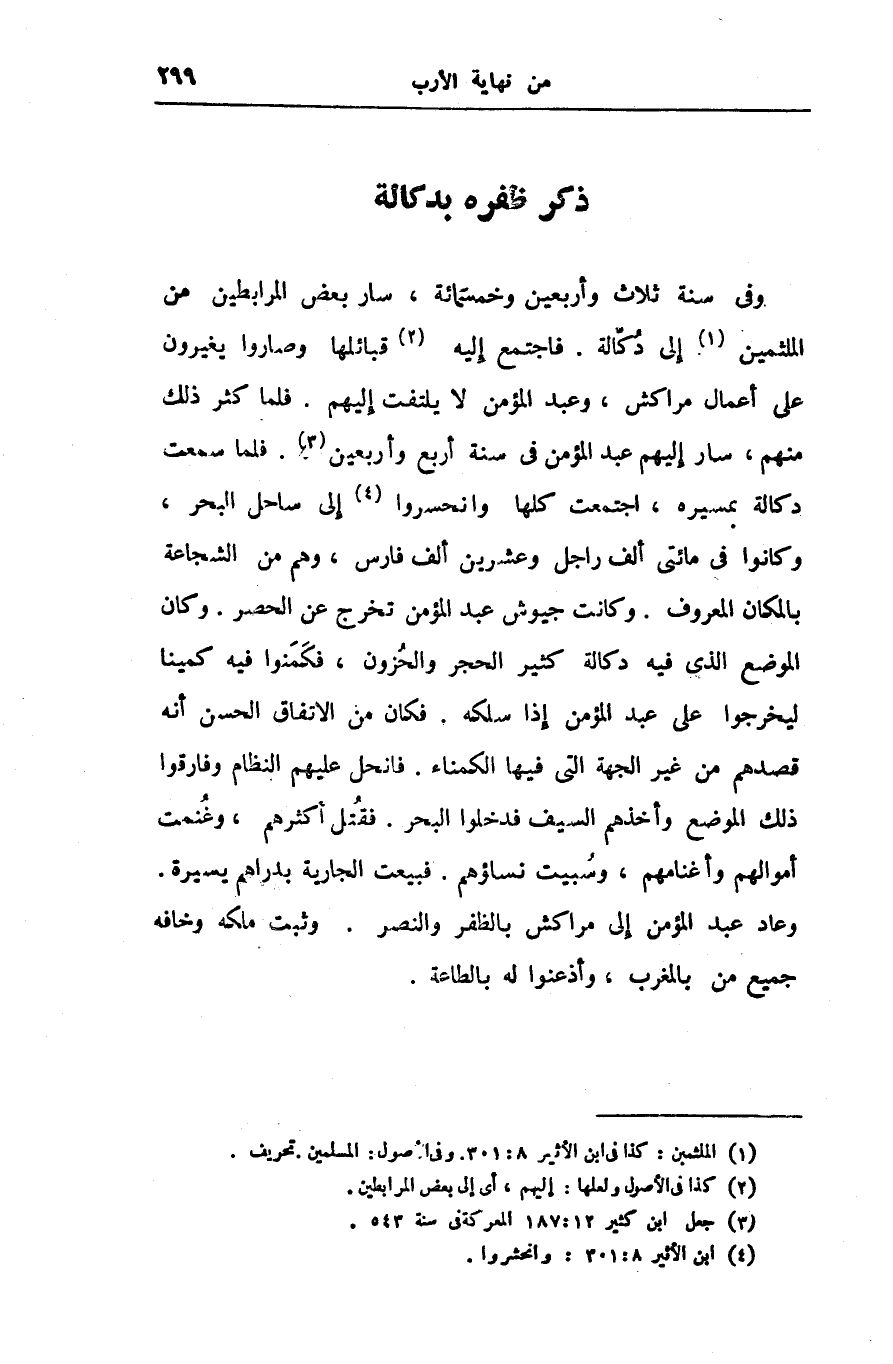 وفى سنة ثلاث وأربعين وخمسمائة، سار بعض المرابطين من الملثمين «1» إلى دكّالة. فاجتمع إليه «2» قبائلها وصاروا يغيرون على أعمال مراكش، وعبد المؤمن لا يلتفت إليهم. فلما كثر ذلك منهم، سار إليهم عبد المؤمن فى سنة أربع وأربعين «3» . فلما سمعت دكالة بمسيره، اجتمعت كلها وانحسروا «4» إلى ساحل البحر، وكانوا فى مائتى ألف راجل وعشرين ألف فارس، وهم من الشجاعة بالمكان المعروف. وكانت جيوش عبد المؤمن تخرج عن الحصر. وكان الموضع الذى فيه دكالة كثير الحجر والحزون، فكمنوا فيه كمينا ليخرجوا على عبد المؤمن إذا سلكه. فكان من الاتفاق الحسن أنه قصدهم من غير الجهة التى فيها الكمناء. فانحل عليهم النظام وفارقوا ذلك الموضع وأخذهم السيف فدخلوا البحر. فقتل أكثرهم، وغنمت أموالهم وأغنامهم، وسبيت نساؤهم. فبيعت الجارية بدراهم يسيرة.