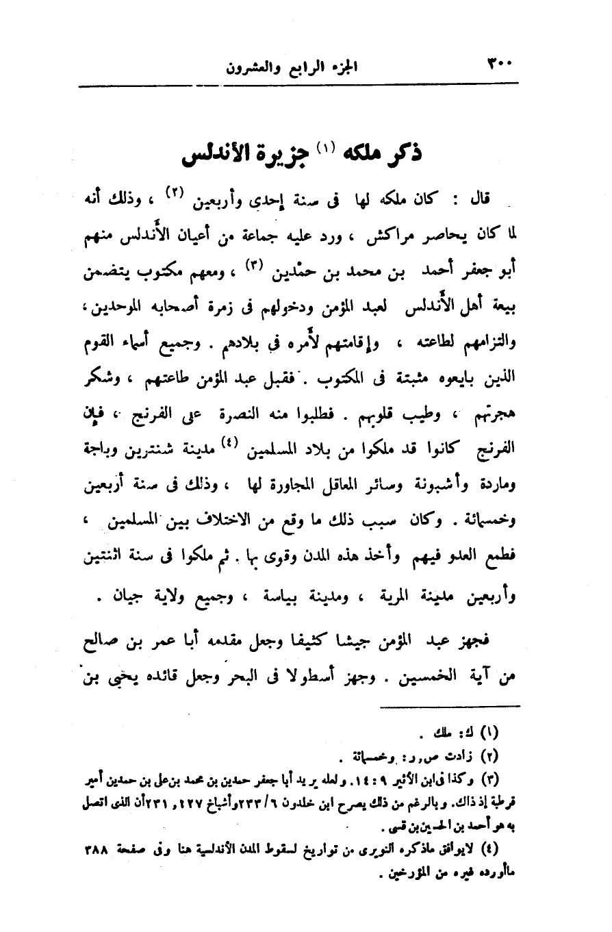 قال: كان ملكه لها فى سنة إحدى وأربعين «2» ، وذلك أنه لما كان يحاصر مراكش، ورد عليه جماعة من أعيان الأندلس منهم أبو جعفر أحمد بن محمد بن حمدين «3» ، ومعهم مكتوب يتضمن بيعة أهل الأندلس لعبد المؤمن ودخولهم فى زمرة أصحابه الموحدين، والتزامهم لطاعته، وإقامتهم لأمره فى بلادهم. وجميع أسماء القوم الذين بايعوه مثبتة فى المكتوب. فقبل عبد المؤمن طاعتهم، وشكر هجرتهم، وطيب قلوبهم. فطلبوا منه النصرة على الفرنج، فإن الفرنج كانوا قد ملكوا من بلاد المسلمين «4» مدينة شنترين وباجة وماردة وأشبونة وسائر المعاقل المجاورة لها، وذلك فى سنة أربعين وخمسمائة. وكان سبب ذلك ما وقع من الاختلاف بين المسلمين، فطمع العدو فيهم وأخذ هذه المدن وقوى بها. ثم ملكوا فى سنة اثنتين وأربعين مدينة المرية، ومدينة بياسة، وجميع ولاية جيان.