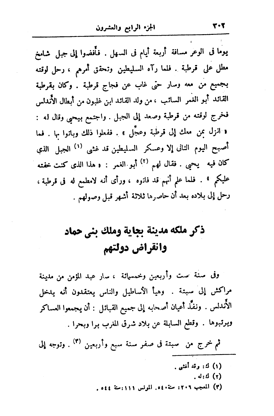 «انزل بمن معك إلى قرطبة وعجّل» . ففعلوا ذلك وباتوا بها. فما أصبح اليوم الثانى إلا وعسكر السليطين قد غشى «1» الجبل الذى كان فيه يحيى. فقال لهم «2» أبو الغمر: «هذا الذى كنت خفته عليكم» . فلما علم أنهم قد فاتوه، ورأى أنه لا مطمع له فى قرطبة، رحل إلى بلاده بعد أن حاصرها ثلاثة أشهر قبل وصولهم.