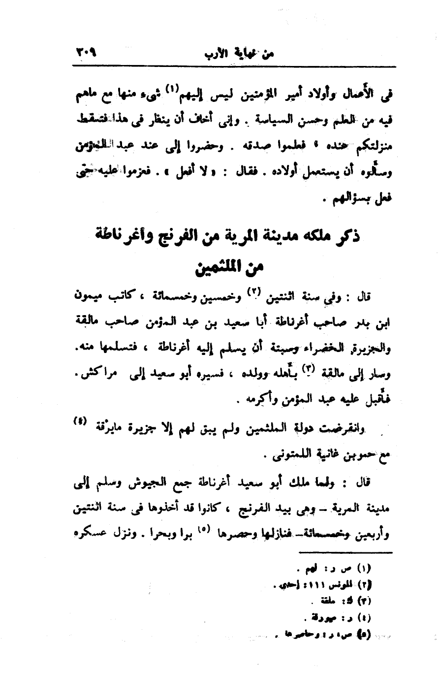 قال: ولما ملك أبو سعيد أغرناطة جمع الجيوش وسلم إلى مدينة المرية- وهى بيد الفرنج، كانوا قد أخذوها فى سنة اثنتين وأربعين وخمسمائة- فنازلها وحصرها «5» برا وبحرا. ونزل عسكره