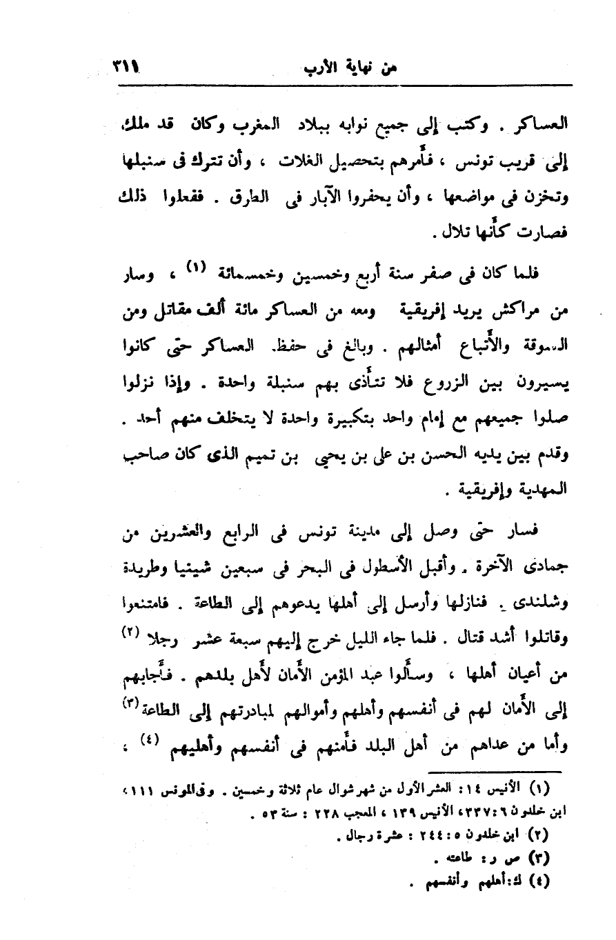 فسار حتى وصل إلى مدينة تونس فى الرابع والعشرين من جمادى الآخرة. وأقبل الأسطول فى البحر فى سبعين شينيا وطريدة وشلندى. فنازلها وأرسل إلى أهلها يدعوهم إلى الطاعة. فامتنعوا وقاتلوا أشد قتال. فلما جاء الليل خرج إليهم سبعة عشر رجلا «2» من أعيان أهلها، وسألوا عبد المؤمن الأمان لأهل بلدهم. فأجابهم إلى الأمان لهم فى أنفسهم وأهلهم وأموالهم لمبادرتهم إلى الطاعة «3» وأما من عداهم من أهل البلد فأمنهم فى أنفسهم وأهليهم «4» ،