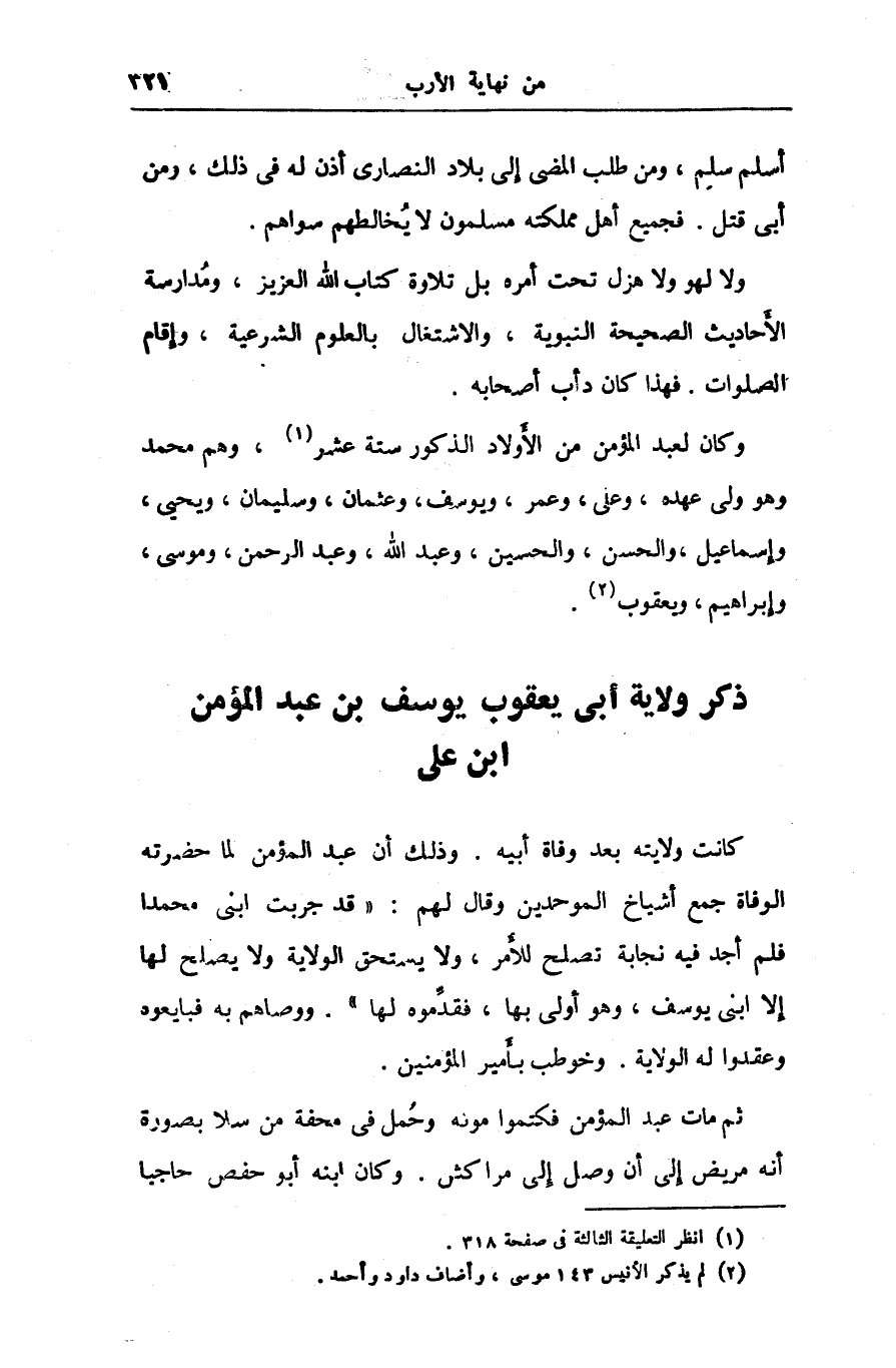 وكان لعبد المؤمن من الأولاد الذكور ستة عشر «1» ، وهم محمد وهو ولى عهده، وعلى، وعمر، ويوسف، وعثمان، وسليمان، ويحيى، وإسماعيل، والحسن، والحسين، وعبد الله، وعبد الرحمن، وموسى، وإبراهيم، ويعقوب «2» .