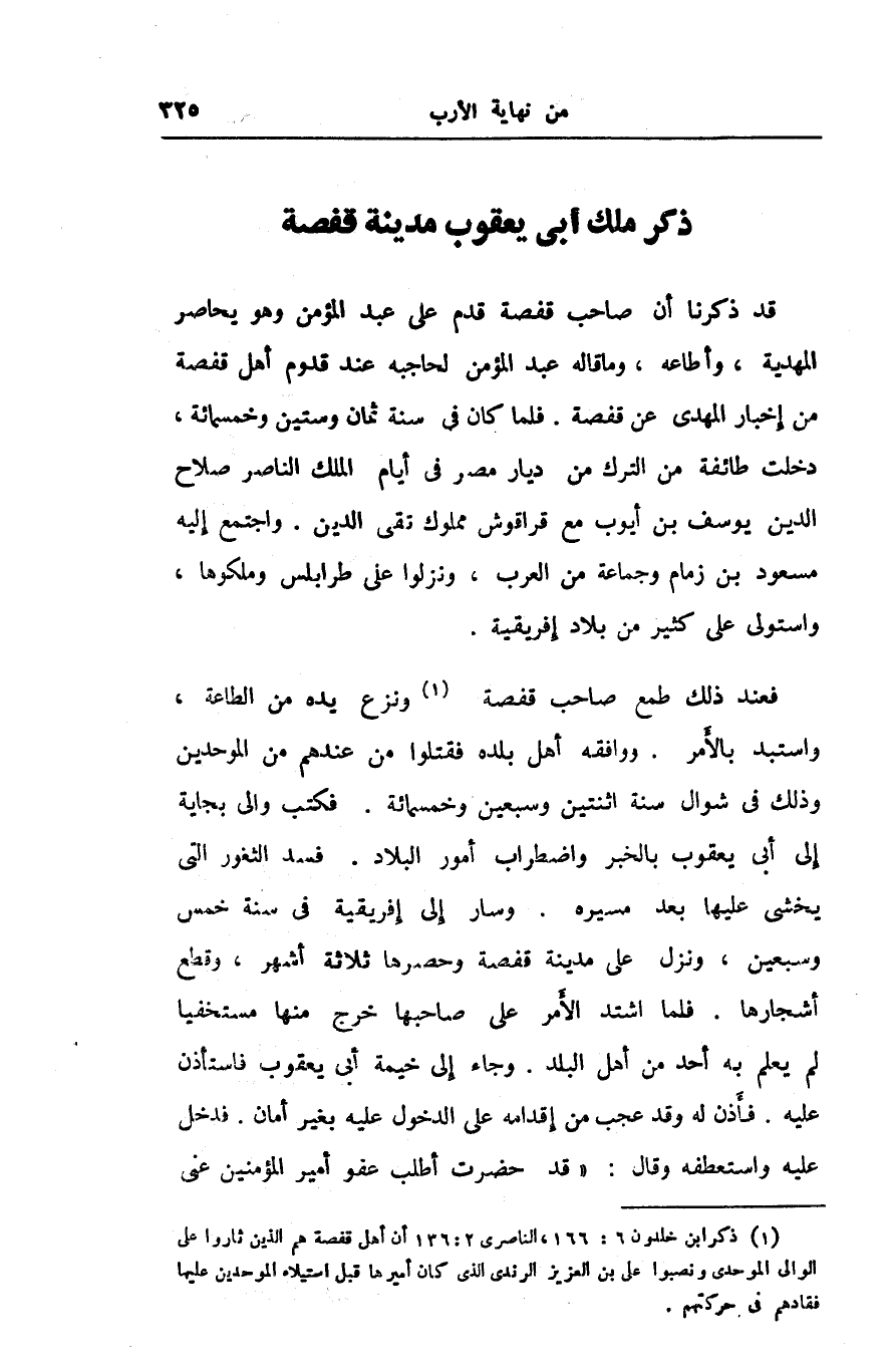 فعند ذلك طمع صاحب قفصة «1» ونزع يده من الطاعة، واستبد بالأمر. ووافقه أهل بلده فقتلوا من عندهم من الموحدين وذلك فى شوال سنة اثنتين وسبعين وخمسمائة. فكتب والى بجاية إلى أبى يعقوب بالخبر واضطراب أمور البلاد. فسد الثغور التى يخشى عليها بعد مسيره. وسار إلى إفريقية فى سنة خمس وسبعين، ونزل على مدينة قفصة وحصرها ثلاثة أشهر، وقطع أشجارها. فلما اشتد الأمر على صاحبها خرج منها مستخفيا لم يعلم به أحد من أهل البلد. وجاء إلى خيمة أبى يعقوب فاستأذن عليه. فأذن له وقد عجب من إقدامه على الدخول عليه بغير أمان. فدخل عليه واستعطفه وقال: «قد حضرت أطلب عفو أمير المؤمنين عنى