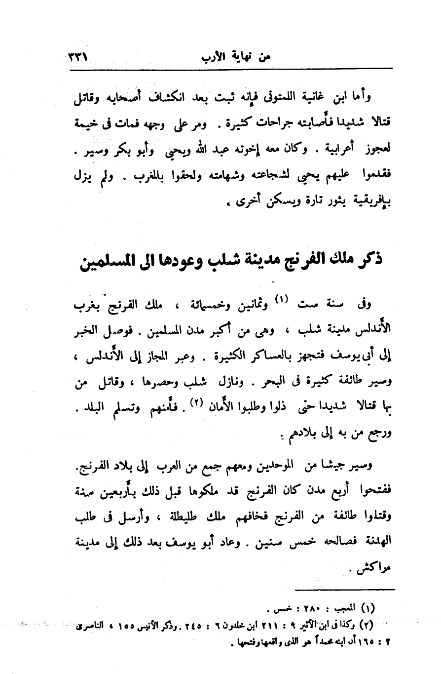 وفى سنة ست «1» وثمانين وخمسمائة، ملك الفرنج بغرب الأندلس مدينة شلب، وهى من أكبر مدن المسلمين. فوصل الخبر إلى أبى يوسف فتجهز بالعساكر الكثيرة. وعبر المجاز إلى الأندلس، وسير طائفة كثيرة فى البحر. ونازل شلب وحصرها، وقاتل من بها قتالا شديدا حتى ذلوا وطلبوا الأمان «2» . فأمنهم وتسلم البلد.