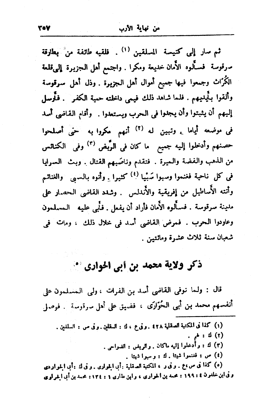 ثم سار إلى كنيسة المسلقين «1» . فلقيه طائفة من بطارقة سرقوسة فسألوه الأمان خديعة ومكرا. واجتمع أهل الجزيرة إلى قلعة الكرّاث وجمعوا فيها جميع أموال أهل الجزيرة. وذل أهل سرقوسة وألقوا بأيديهم. فلما شاهد ذلك فيمى داخلته حمية الكفر. فأرسل إليهم أن يثبتوا وأن يجدوا فى الحرب ويستعدوا. وأقام القاضى أسد فى موضعه أياما. وتبين له «2» أنهم مكروا به حتى أصلحوا حصنهم وأدخلوا إليه جميع ما كان فى الرّبض «3» وفى الكنائس من الذهب والفضة والميرة. فتقدم وناصبهم القتال. وبث السرايا فى كل ناحية فغنموا وسبوا سبيا «4» كثيرا. وأتوه بالسبى والغنائم وأتته الأساطيل من إفريقية والأندلس. وشدد القاضى الحصار على مدينة سرقوسة. فسألوه الأمان فأراد أن يفعل. فأبى عليه المسلمون وعاودوا الحرب. فمرض القاضى أسد فى خلال ذلك، ومات فى شعبان سنة ثلاث عشرة ومائتين.