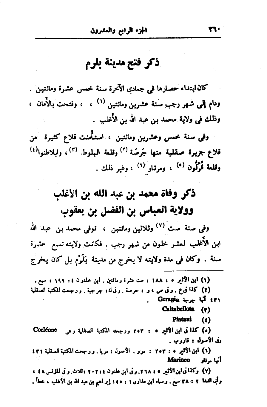 وفى سنة ست «7» وثلاثين ومائتين، توفى محمد بن عبد الله ابن الأغلب لعشر خلون من شهر رجب. فكانت ولايته تسع عشرة سنة. وكان فى مدة ولايته لا يخرج من مدينة بلرم بل كان يخرج