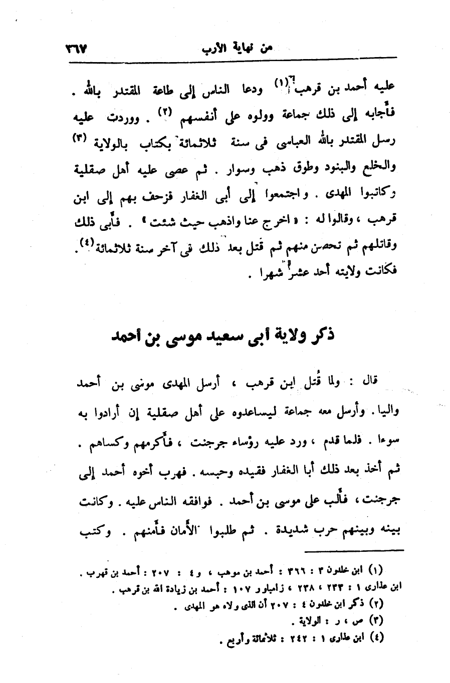 فأجابه إلى ذلك جماعة وولوه على أنفسهم «2» . ووردت عليه رسل المقتدر بالله العباسى فى سنة ثلاثمائة بكتاب بالولاية «3» والخلع والبنود وطوق ذهب وسوار. ثم عصى عليه أهل صقلية وكاتبوا المهدى. واجتمعوا إلى أبى الغفار فزحف بهم إلى ابن قرهب، وقالوا له: «اخرج عنا واذهب حيث شئت» . فأبى ذلك وقاتلهم ثم تحصن منهم ثم قتل بعد ذلك فى آخر سنة ثلاثمائة «4» .