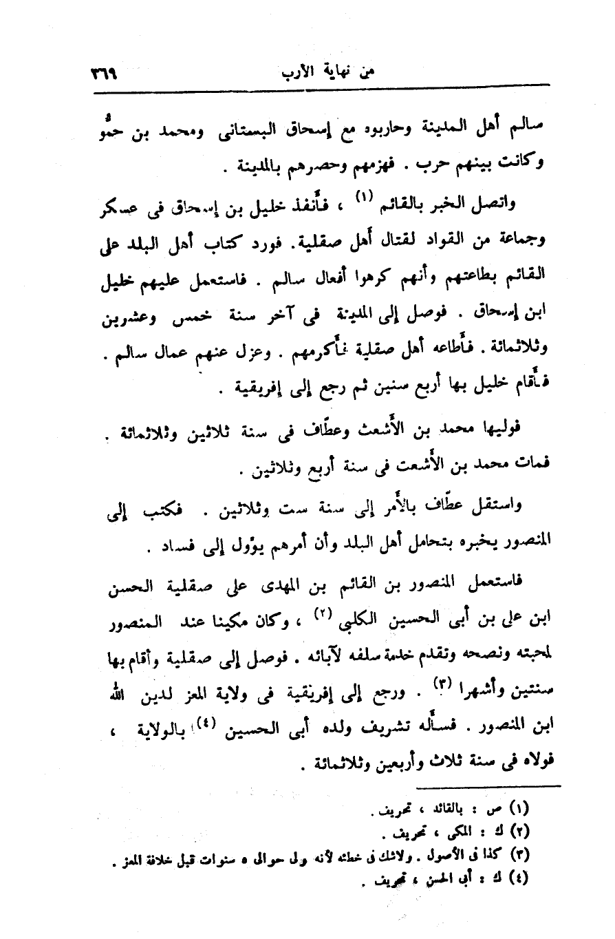 واتصل الخبر بالقائم «1» ، فأنفذ خليل بن إسحاق فى عسكر وجماعة من القواد لقتال أهل صقلية. فورد كتاب أهل البلد على القائم بطاعتهم وأنهم كرهوا أفعال سالم. فاستعمل عليهم خليل ابن إسحاق. فوصل إلى المدينة فى آخر سنة خمس وعشرين وثلاثمائة. فأطاعه أهل صقلية فأكرمهم. وعزل عنهم عمال سالم.