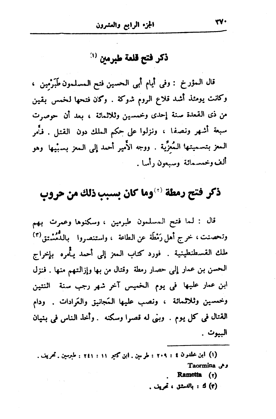 قال: لما فتح المسلمون طبرمين، وسكنوها وعمرت بهم وتحصنت، خرج أهل رمطة عن الطاعة، واستنصروا بالدّمستق «3» ملك القسطنطينية. فورد كتاب المعز إلى أحمد يأمره بإخراج الحسن بن عمار إلى حصار رمطة وقتال من بها وإزالتهم منها. فنزل ابن عمار عليها فى يوم الخميس آخر شهر رجب سنة اثنتين وخمسين وثلاثمائة، ونصب عليها المجانيق والعرادات. ودام القتال فى كل يوم. وبنى له قصرا وسكنه. وأخذ الناس فى بنيان البيوت.