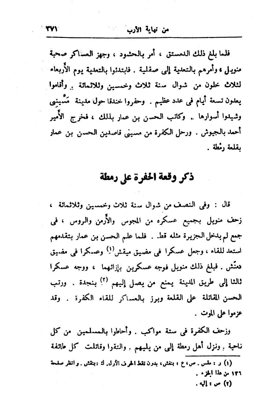 قال: وفى النصف من شوال سنة ثلاث وخمسين وثلاثمائة، زحف منويل بجميع عسكره من المجوس والأرمن والروس، فى جمع لم يدخل الجزيرة مثله قط. فلما علم الحسن بن عمار بتقدمهم استعد للقاء، وجعل عسكرا فى مضيق ميقش «1» وعسكرا فى مضيق دمنّش. فبلغ ذلك منويل فوجه عسكرين بإزائهما، ووجه عسكرا ثالثا إلى طريق المدينة يمنع من يصل إليهم «2» بنجدة. ورتب الحسن المقاتلة على القلعة وبرز بالعساكر للقاء الكفرة. وقد عزموا على الموت.
