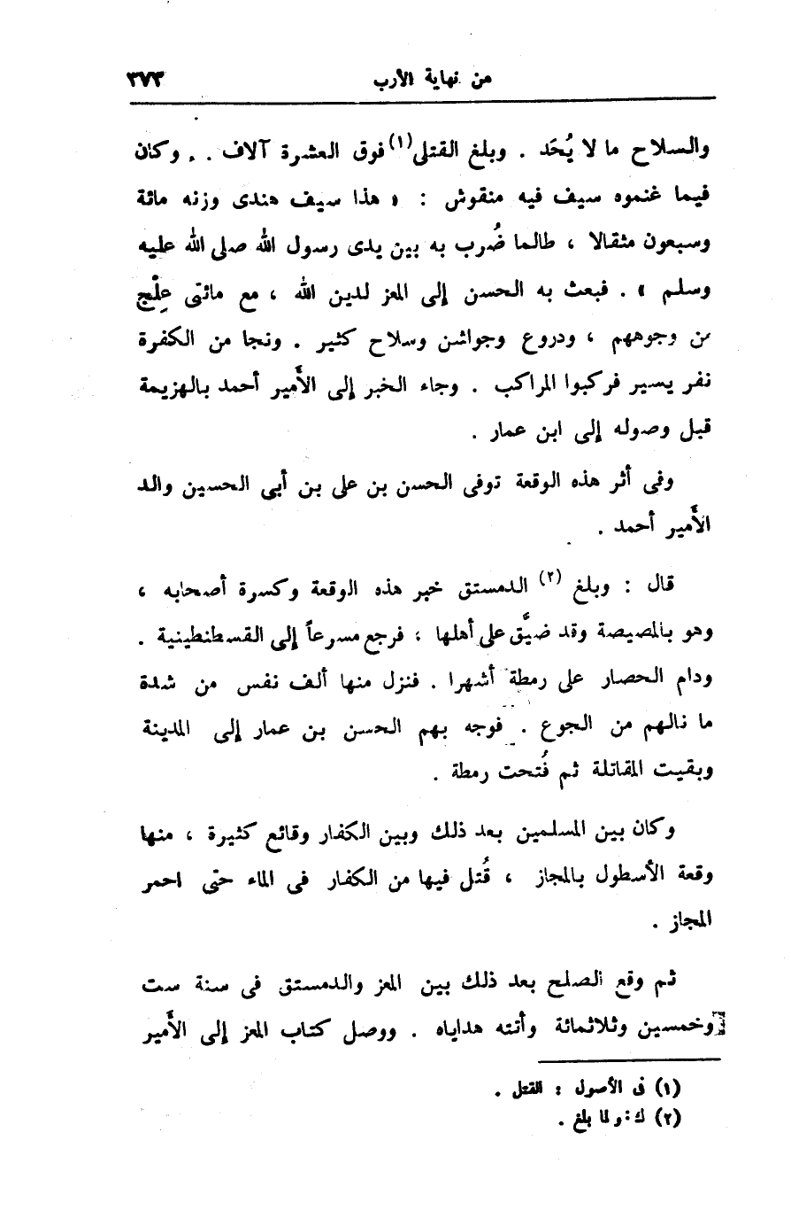 والسلاح ما لا يحد. وبلغ القتلى «1» فوق العشرة آلاف. وكان فيما غنموه سيف فيه منقوش: «هذا سيف هندى وزنه مائة وسبعون مثقالا، طالما ضرب به بين يدى رسول الله صلّى الله عليه وسلم» . فبعث به الحسن إلى المعز لدين الله، مع مائتى علج من وجوههم، ودروع وجواشن وسلاح كثير. ونجا من الكفرة نفر يسير فركبوا المراكب. وجاء الخبر إلى الأمير أحمد بالهزيمة قبل وصوله إلى ابن عمار.
