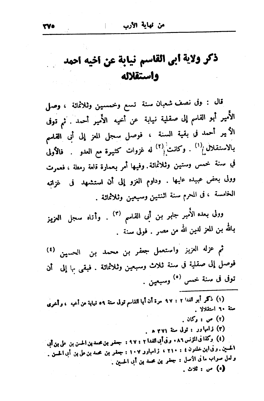 قال: وفى نصف شعبان سنة تسع وخمسين وثلاثمائة، وصل الأمير أبو القاسم إلى صقلية نيابة عن أخيه الأمير أحمد. ثم توفى الأمير أحمد فى بقية السنة، فوصل سجل المعز إلى ألى القاسم بالاستقلال «1» . وكانت «2» له غزوات كثيرة مع العدو. فالأولى فى سنة خمس وستين وثلاثمائة. وفيها أمر بعمارة قلعة رمطة، فعمرت وولى بعض عبيده عليها. ودوام الغزو إلى أن استشهد فى غزاته الخامسة، فى المحرم سنة اثنتين وسبعين وثلاثمائة.