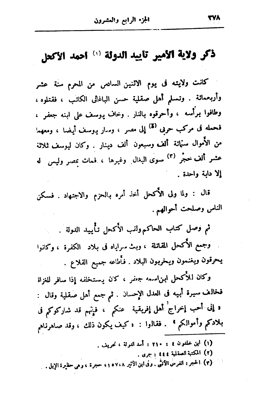 ثم وصل كتاب الحاكم ولقب الأكحل تأييد الدولة.