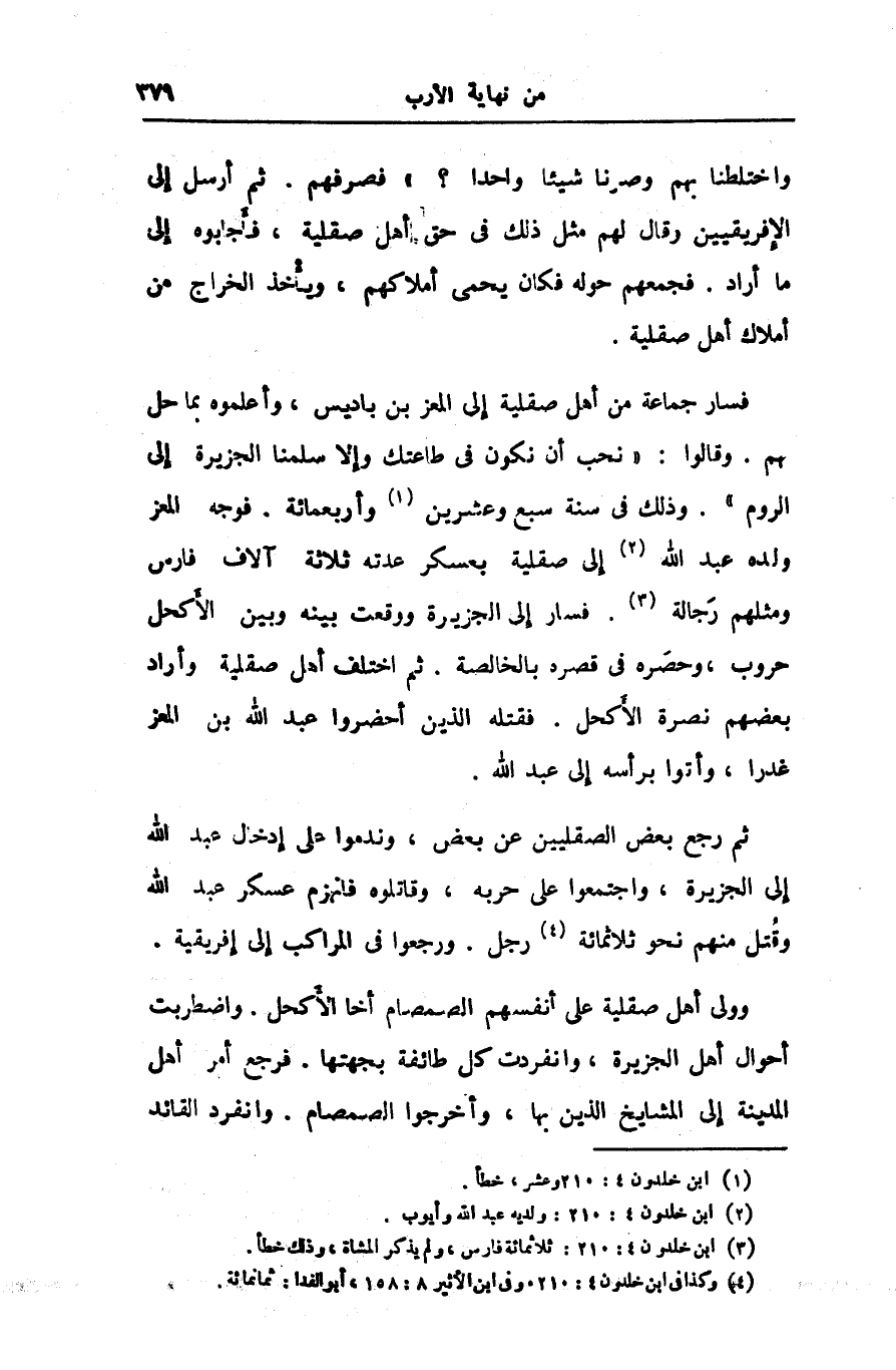 فسار جماعة من أهل صقلية إلى المعز بن باديس، وأعلموه بما حل بهم. وقالوا: «نحب أن نكون فى طاعتك وإلا سلمنا الجزيرة إلى الروم» . وذلك فى سنة سبع وعشرين «1» وأربعمائة. فوجه المعز ولده عبد الله «2» إلى صقلية بعسكر عدته ثلاثة آلاف فارس ومثلهم رجالة «3» . فسار إلى الجزيرة ووقعت بينه وبين الأكحل حروب، وحصره فى قصره بالخالصة. ثم اختلف أهل صقلية وأراد بعضهم نصرة الأكحل. فقتله الذين أحضروا عبد الله بن المعز غدرا، وأتوا برأسه إلى عبد الله.