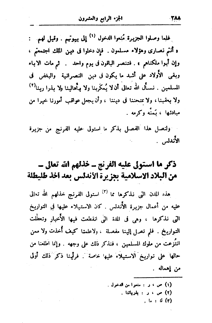 «أنتم نصارى وهؤلاء مسلمون. فإن دخلوا فى دين الملك اجتمعتم، وإن أبوا ملكناهم» . فتنصر الباقون فى يوم واحد. ثم مات الاباء وبقى الأولاد على أشد ما يكون فى دين النصرانية والبغض فى المسلمين. نسأل الله تعالى أن لا يمكربنا ولا بأهالينا ولا بذرا رينا «2» ولا بعقبنا، ولا بمتحننا فى ديننا، وأن يجعل عواقب أمورنا خيرا من مبادئها، بمنّه وكرمه.