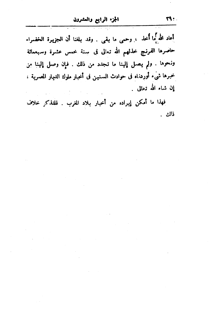 أعاد الله ما أخذ، وحمى ما بقى. وقد بلغنا أن الجزيرة الخضراء حاصرها الفرنج خذلهم الله تعالى فى سنة خمس عشرة وسبعمائة ونحوها. ولم يصل إلينا ما تجدد من ذلك. فإن وصل إلينا من خبرها شىء أوردناه فى حوادث السنين فى أخبار ملوك الديار المصرية.
