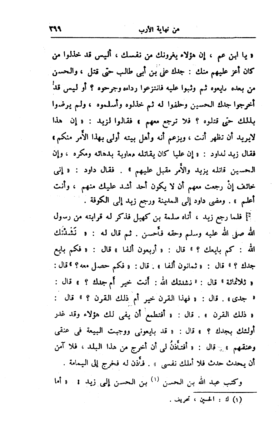فلما رجع زيد، أتاه سلمة بن كهيل فذكر له قرابته من رسول الله صلّى الله عليه وسلّم وحقه فأحسن. ثم قال له: «نشدتك الله: كم بايعك؟» قال: «أربعون ألفا» قال: «فكم بايع جدك؟» قال: «ثمانون ألفا» . قال: «فكم حصل معه؟» قال: