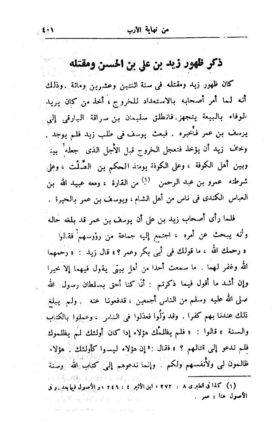 كان ظهور زيد ومقتله فى سنة اثنتين وعشرين ومائة. وذلك أنه لما أمر أصحابه بالاستعداد للخروج، أخذ من كان يريد الوفاء بالبيعة يتجهز. فانطلق سليمان بن سراقة البارقى إلى يوسف بن عمر فأخبره. فبعث يوسف فى طلب زيد فلم يوجد.