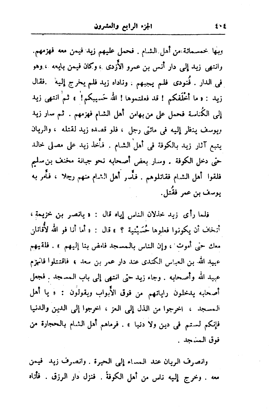 وانتهى زيد إلى دار أنس بن عمرو الأزدى، وكان فيمن بايعه، وهو فى الدار. فنودى فلم يجبهم. وناداه زيد فلم يخرج إليه. فقال زيد: «ما أخلّفكم! قد فعلتموها! الله حسيبكم!» ثم انتهى زيد إلى الكناسة فحمل على من بهامن أهل الشام فهزمهم. ثم سار زيد ويوسف ينظر إليه فى مائتى رجل، فلو قصده زيد لقتله، والريان يتبع آثار زيد بالكوفة فى أهل الشام. فأخذ زيد على مصلى خالد حتى دخل الكوفة. وسار بعض أصحابه نحو جبانة مخنف بن سليم فلقوا أهل الشام فقاتلوهم. فأسر أهل الشام منهم رجلا، فأمر به يوسف بن عمر فقتل.
