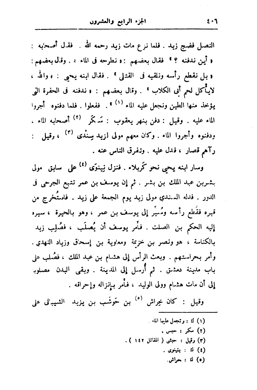 وسار ابنه يحيى نحو كربلاء. فنزل نينوى «4» على سابق مولى بشر بن عبد الملك بن بشر. ثم إن يوسف بن عمر تتبع الجرحى فى الدور. فدله السندى مولى زيد يوم الجمعة على زيد. فاستخرج من قبره فقطع رأسه وسير إلى يوسف بن عمر، وهو بالحيرة، سيره إليه الحكم بن الصلت. فأمر يوسف أن يصلب، فصلب زيد بالكناسة، هو ونصر بن خزيمة ومعاوية بن إسحاق وزياد النهدى.